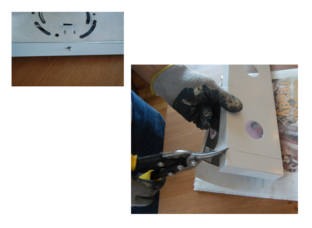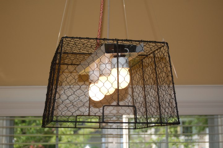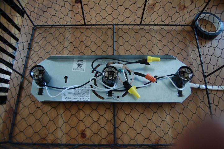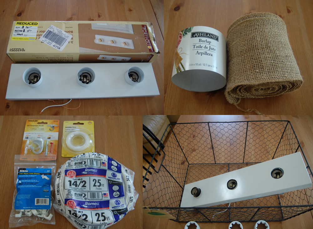 The wire basket is a good frame for a lamp shade and burlap can hide ugly part of the light fixture, but still lets the light shine through it. As you can see above, the bathroom fixture didn’t fit into the basket, so we cut it to fit.